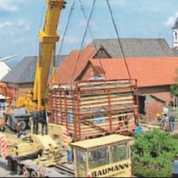11. und 12. Juni | Sensationeller Transport ins Freilichtmuseum nach Detmold. Das 165 Jahre alte Tagelöhnerhaus von Heinrich Simon, Rösebeck Nr. 85, geht auf einem 48 Meter langen, 100 Tonnen schweren Tieflader mit 66 Rädern auf 17 Achsen in einem Stahlkorsett auf „große Reise" ins Freilichtmuseum nach Detmold. Laut Aussage von Dr. Joachim Kleinmanns, Bauhistoriker vom Freilichtmuseum, ist in der Bundesrepublik Deutschland und in den angrenzenden Ländern noch nie ein so altes Haus als Ganzes transportiert worden. Auch für unseren Ort Rösebeck ein einmaliges Ereignis. |
